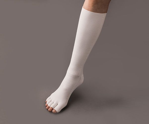 采用贴合脚形的编织构造提高服贴感,并对局部进行压力处理(高弹处理),在治疗淋巴水肿等医疗领域将能得到广泛应用。